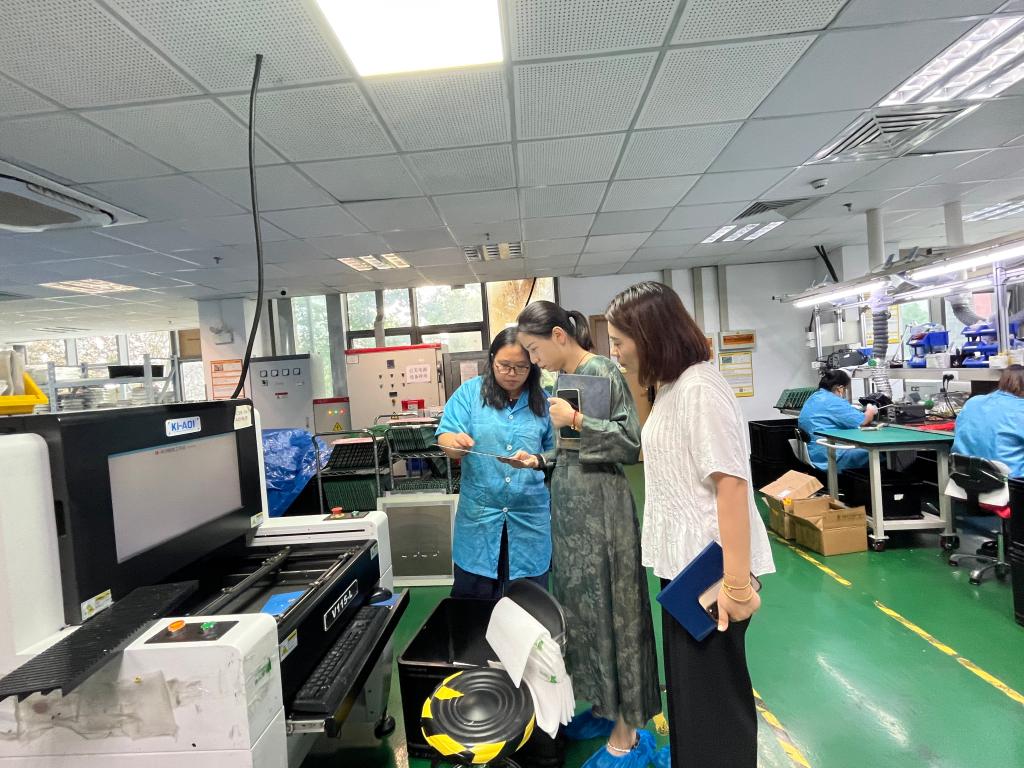 在公司主管的陪同下,教师们实地走访了生产车间、研发实验室与品控中心,系统了解了从材料预处理、精密焊接、芯片封装到成品测试的全流程工艺。主管就关键工序的技术规范与质量控制要点作了细致讲解,使教师们对光电产品的现代化生产体系有了更直观深入的认识。