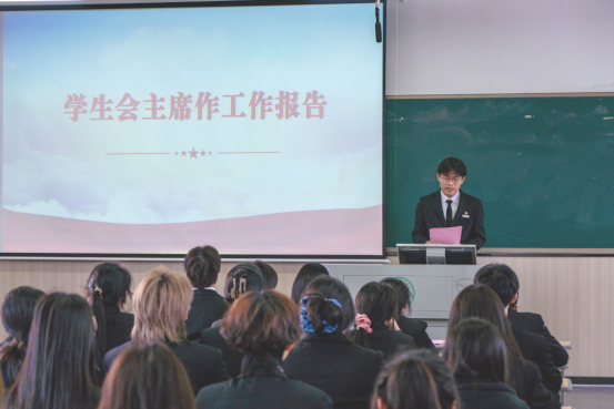 学生会成员展瑞同学代第九届学生会主席团,向大会进行工作报告。他指出,过去一年学生会积极举办多元文化活动,营造浓厚学习氛围;开展红色教育,筑牢思想根基;组织寒暑假社会实践,增进专业与实际结合。未来将进一步开展活动,增强青年学子的责任感与使命感。